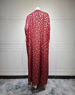 La couleur rouge profonde, associée à la sous-robe blanche et aux reflets dorés, crée un contraste saisissant et une présence charismatique, célébrant la beauté et la puissance féminine avec une dignité intemporelle. C'est plus qu'une tenue, c'est une affirmation de votre identité et de votre appréciation pour le luxe authentique.