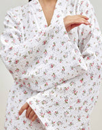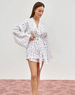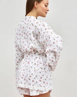 L'esthétique de cet ensemble est une œuvre à part entière. Le motif n'est pas un simple imprimé ; c'est une esquisse poétique où des touches de rose poudré et de vert tendre dansent sur un fond immaculé, évoquant une fresque printanière. L'architecture même du vêtement est un parti-pris. La coupe du kimono, avec son col en V plongeant et ses manches "chauve-souris" aux volumes spectaculaires, n'est pas seulement un hommage à une élégance intemporelle, c'est un geste créatif qui redéfinit votre silhouette. Chaque ligne, chaque courbe est dessinée pour vous conférer une allure qui mêle la puissance à la grâce, une présence audacieuse même dans la quiétude de votre intimité.