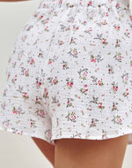 - Couleur et motif : tissu blanc ou écru avec motif floral délicat (fleurs roses/rouge pâle, feuilles vertes, petits points sombres)