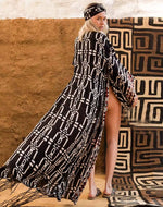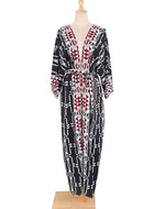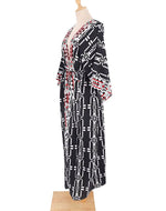 Chaque détail est une ligne de force dans cette composition. Le décolleté plongeant en V esquisse une féminité assumée, tandis que les manches d'une ampleur spectaculaire confèrent une gestuelle théâtrale à chacun de vos pas. La ceinture, ponctuée de ses disques ornementaux, n'est pas un accessoire mais le point d'ancrage qui vient sculpter votre taille avec une précision artistique. Une fente haute audacieuse libère la jambe, insufflant un dynamisme chic à la structure. Enfin, les motifs ne sont pas un simple décor. Ils sont le récit d'un ailleurs, une calligraphie tribale où le noir profond, le blanc cassé et le rouge bordeaux dialoguent pour raconter une épopée d'audace et d'indépendance.
