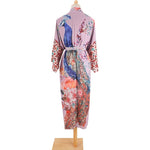- Design Artistique Unique : Avec son motif exclusif de paons majestueux et de fleurs luxuriantes sur un fond violet doux, ce kimono est une véritable œuvre d'art textile. Il vous permet de vous démarquer avec une pièce qui reflète votre personnalité et votre goût pour l'exotisme et la beauté intemporelle.