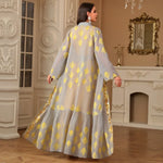 Plus qu'un simple vêtement, l'Ensemble Kimono Abaya Jaune Brodé est une expression de l'artisanat et de la beauté. Les broderies fines et les applications de sequins dorés le long de l'ouverture du kimono, ainsi que les motifs de feuilles stylisées, transforment cette pièce en une œuvre d'art portable. La juxtaposition du jaune solaire de la robe intérieure et du gris semi-transparent du kimono crée un contraste riche et visuellement stimulant, évoquant à la fois la lumière et la profondeur. C'est une invitation à rayonner, à chaque mouvement, avec une tenue qui raconte une histoire de raffinement et d'authenticité.