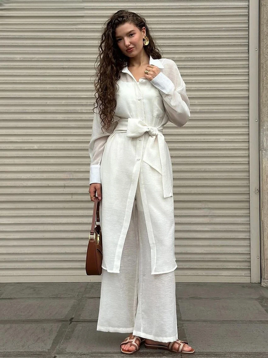 - Composants : Tunique longue type chemise (col classique, patte de boutonnage, manches longues aux poignets structurés, poche poitrine), Pantalon large fluide