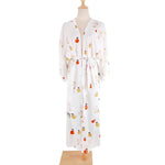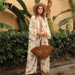 - Design : Kimono long fluide avec imprimé tropical (arbre, oiseaux, fruits) sur fond blanc cassé