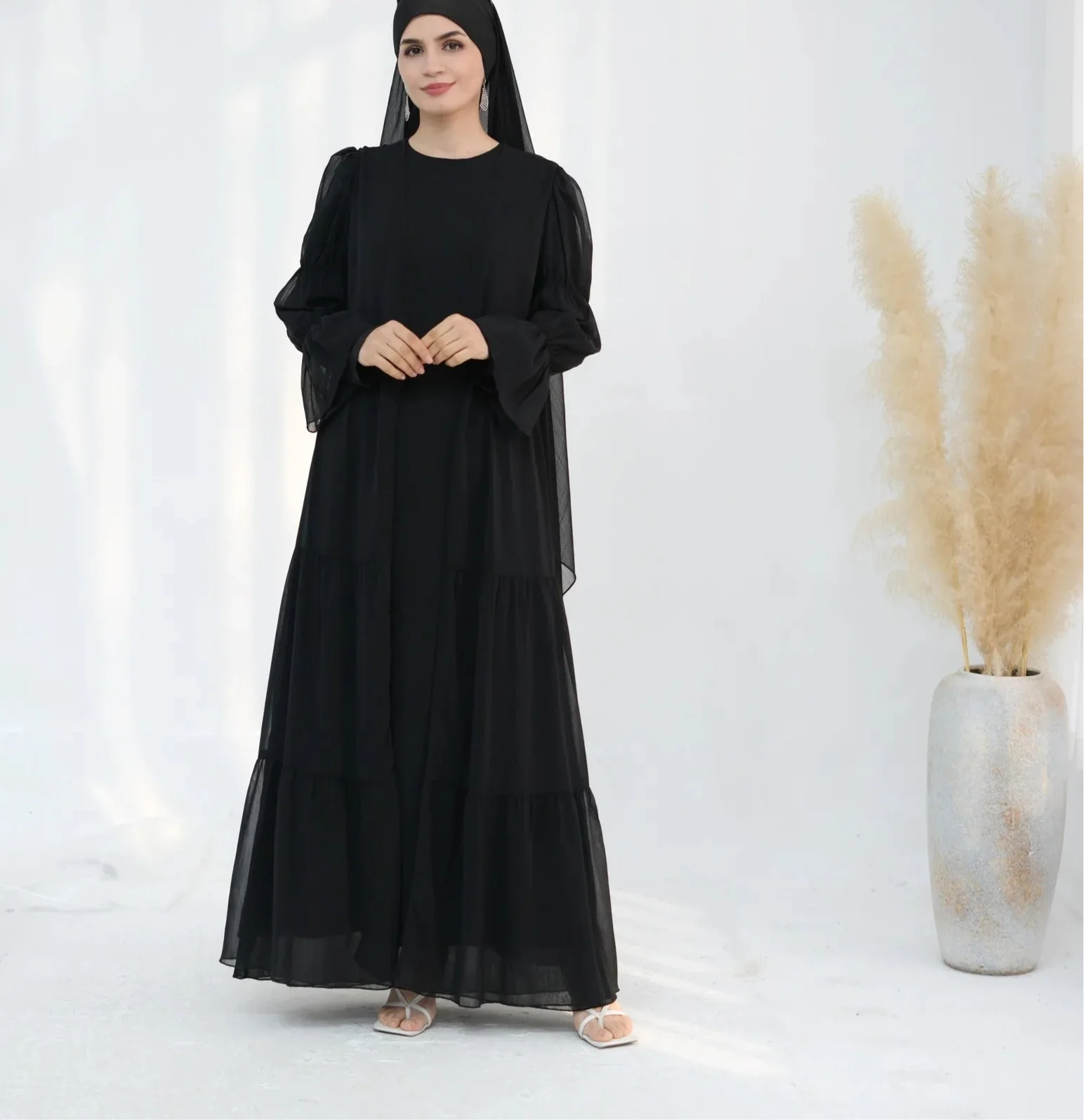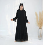 - Composition de l'ensemble : Robe intérieure + Abaya ouverte + Foulard assorti.