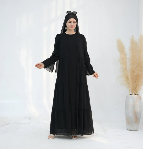 Les volants superposés sur la partie inférieure de la robe intérieure confèrent un mouvement délicat et une texture visuelle unique, tandis que les manches bouffantes ajoutent une dimension résolument moderne. Le choix du tissu, une mousseline légère, enveloppe la silhouette d'un voile subtilement semi-transparent, capturant la lumière pour un effet des plus élégants, sublimant le noir classique de cet ensemble.