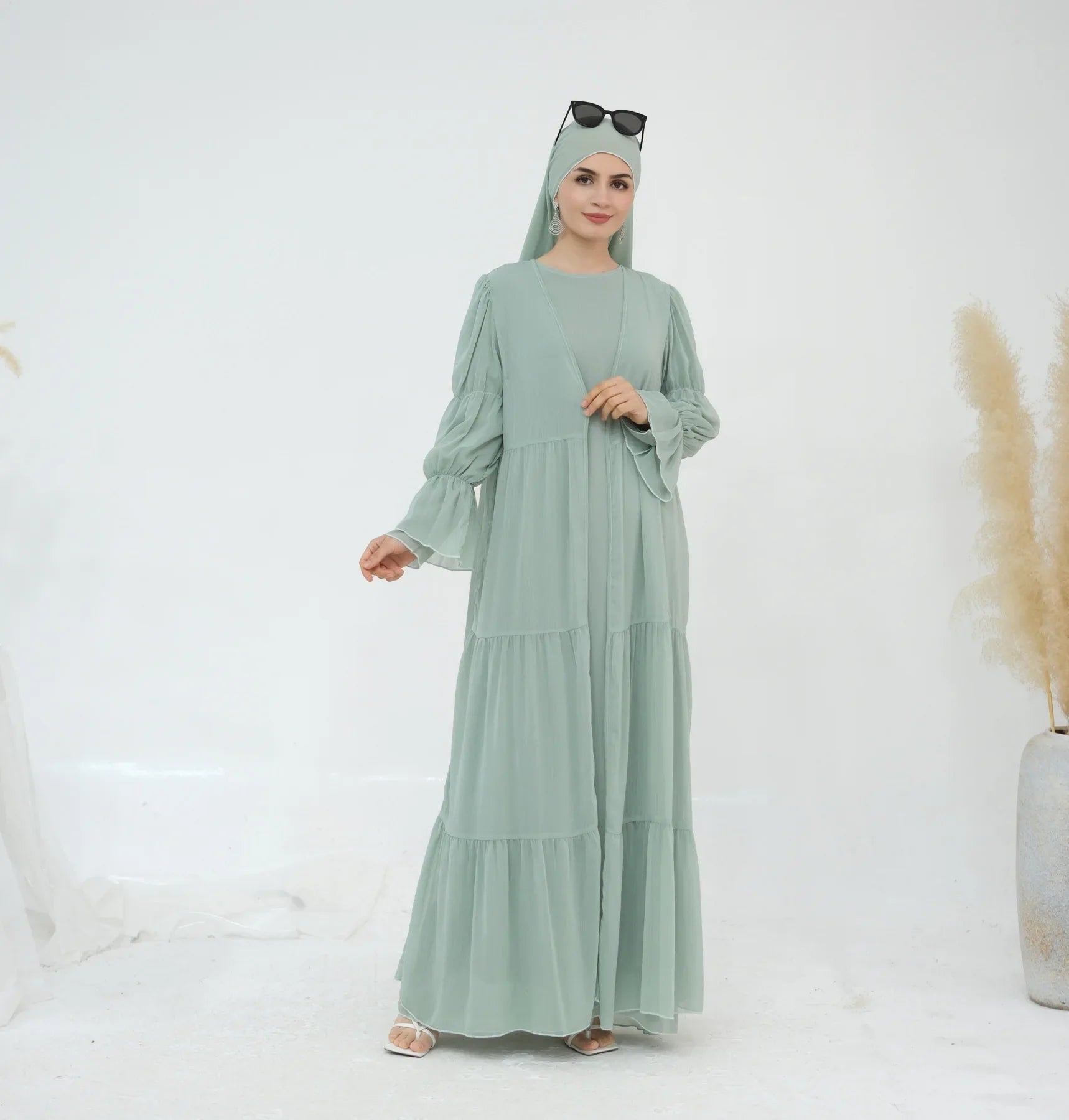 • L'harmonie parfaite, sans effort : oubliez les assortiments complexes ! Cet ensemble est une tenue complète et parfaitement coordonnée, comprenant une robe intérieure, une abaya ouverte et un foulard assorti. Vous êtes prête en un instant, avec une allure impeccable et harmonieuse.