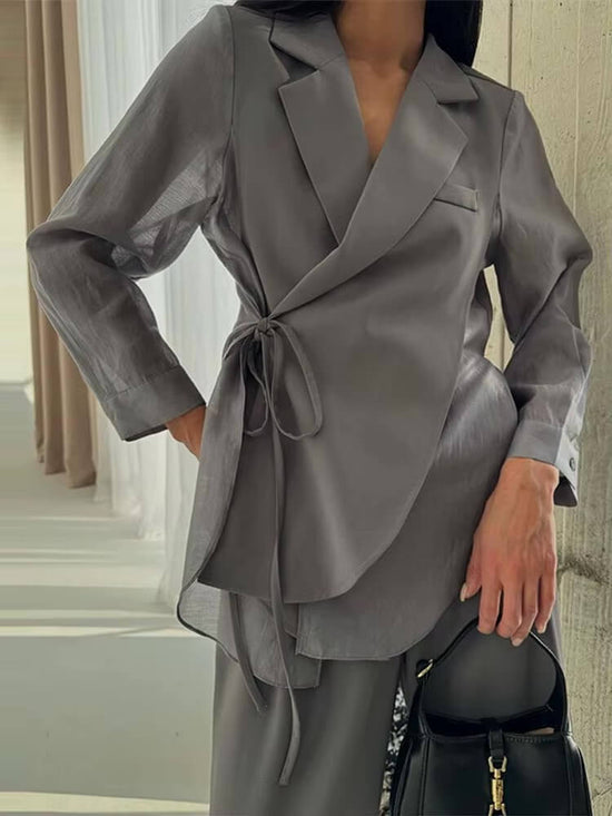 - Haut : Style kimono portefeuille, col à revers, décolleté en V, liens à nouer ajustables à la taille, manches longues avec poignets larges et évasés, ourlet asymétrique (plus court devant, plus long derrière).